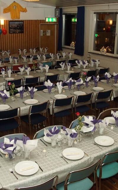 Vill du ordna en fest finns porslin, glas och bestick för 50 personer. Möjlighet att duka i tre olika salar. Köket är utrustat med spis, ugn, micro, kyl och kaffebryggare men ingen diskmaskin.
