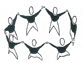 - Övriga sex dansare fattar varandras händer och tar ett steg tillbaka för att ge utrymme åt de två i mitten.